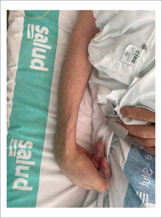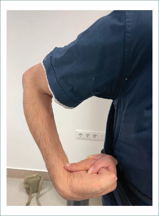 Acudió con el brazo en cabestrillo, con abducción en 60º y retropulsión de espalda, contractura en flexión de 100º del codo, muñeca y mano “en garra” ambos a 90º, con lesiones por decúbito en uñas en región palmar. La inspección de la piel reveló una mano edematizada y con xerosis cutánea. La mano se mostró completamente afuncional y con gran dificultad para su exploración debido al dolor (Fig. 1).