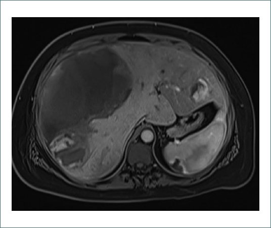 Figura 1. Corte axial de RMN hepática en secuencia T1 con saturación grasa y tras la administración de contraste, en fase arterial-precoz. Se evidencia hematoma de aproximadamente 15x12x19 cm (APxLxCC), con márgenes irregulares de predominio en segmentos anteriores del lóbulo hepático derecho y que se extienden hacia segmentos posteriores, así como segmento 4. En lóbulo hepático izquierdo se observa otro adenoma con captación típica en fases arteriales precoces.