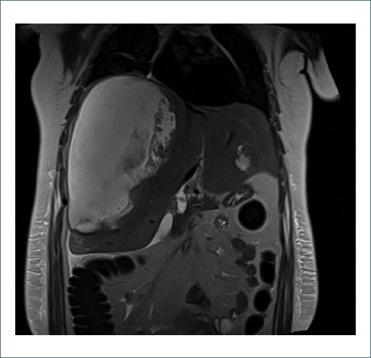 Figura 2. Corte coronal de RMN hepática en secuencia T2 con saturación grasa. Se visualiza voluminoso hematoma derecho que condiciona elevación del hemidiafragma derecho. En lóbulo hepático izquierdo se visualiza adenoma que ya visualizábamos en la figura 1.