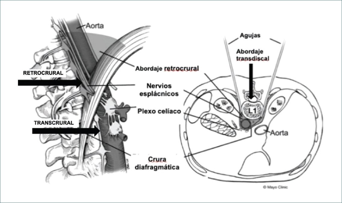 La ubicación anatómica predecible de los nervios esplácnicos y su accesibilidad mediante un abordaje posterior convierten su bloqueo en una alternativa viable al bloqueo anterior del plexo celíaco en pacientes con dolor abdominal crónico. Un mayor conocimiento anatómico permite la administración de volúmenes reducidos de anestésico local, optimizando la duración y efectividad del alivio analgésico.