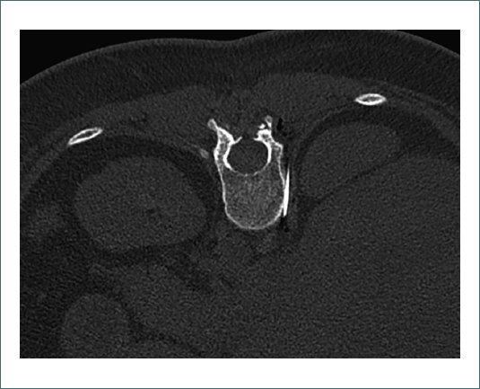 Dado el mal control analgésico y los elevados requerimientos de opioides, se opta por el abordaje de nervios esplácnicos (Fig. 3) derechos guiados por tomografía axial computerizada (TAC) (Fig. 4) mediante acceso retrocrural en decúbito prono. Se lleva a cabo bajo sedación endovenosa colaborativa y anestesia local en el punto de punción. Estimulación sensitiva positiva a 0,7 V (sensación dolorosa en epigastrio) y estimulación motora negativa hasta 2,5 V radiofrecuencia pulsada (RFP) 4 min, 42º, 45 V, 20 pps. Al finalizar la RFP se administra ropivacaína 0,5% más acetato de triamcinolona 20 mg.