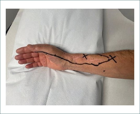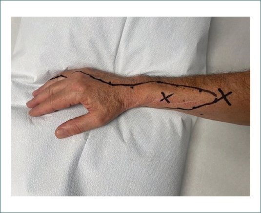 Paciente de 56 años, hipertenso en tratamiento farmacológico, carpintero de profesión. Sufre un accidente con traumatismo en el borde radial de la muñeca derecha con resultado de una herida cutánea y lesión tendinosa con déficit de extensión del pulgar. En un primer tiempo se realiza sutura de la herida y al mes siguiente cirugía de reparación tendinosa. El paciente evoluciona con dolor neuropático espontáneo grave y constante tipo disestésico. A la exploración física se aprecia dolor evocado de tipo hiperalgesia y alodinia mecánica en los territorios de los nervios cutáneo antebraquial lateral (NCAL) y radial superficial (NRS), con signo de Tinel sobre el tronco del NRS y una pérdida de movilidad del dedo pulgar, probablemente limitada por dolor. Una electromiografía confirma la lesión del NRS de tipo axonotmesis parcial grave, con pérdida axonal del 90% respecto al lado contralateral. Se realiza cirugía de resección del neuroma de la rama sensitiva del nervio radial y neurotomía del nervio interóseo posterior. No se aprecian cambios en la intensidad y características del dolor. Se interviene una segunda vez realizándose una resección del neuroma, pero tampoco hay mejoría. Se practica una tercera cirugía realizándose una reconstrucción microquirúrgica con aloinjerto de la rama sensitiva del nervio radial, pero tampoco esta vez el paciente experimenta alivio del dolor. Finalmente se realiza una nueva neurectomía del NRS. En total se practican cuatro cirugías de nervio y ninguna de ellas consigue mejorar la clínica de dolor neuropático grave, que sigue siendo constante y afecta significativamente a la calidad de vida del paciente.
