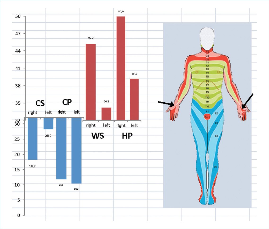 Tabla 1. Método de límites realizado en el área de estudio y comparándolo con la misma área en el lado contralateral, media de 3 repeticiones para el valor umbral de la sensación de frío (CS), sensación de calor (WS), dolor por frío (CP) y dolor por calor (HP)